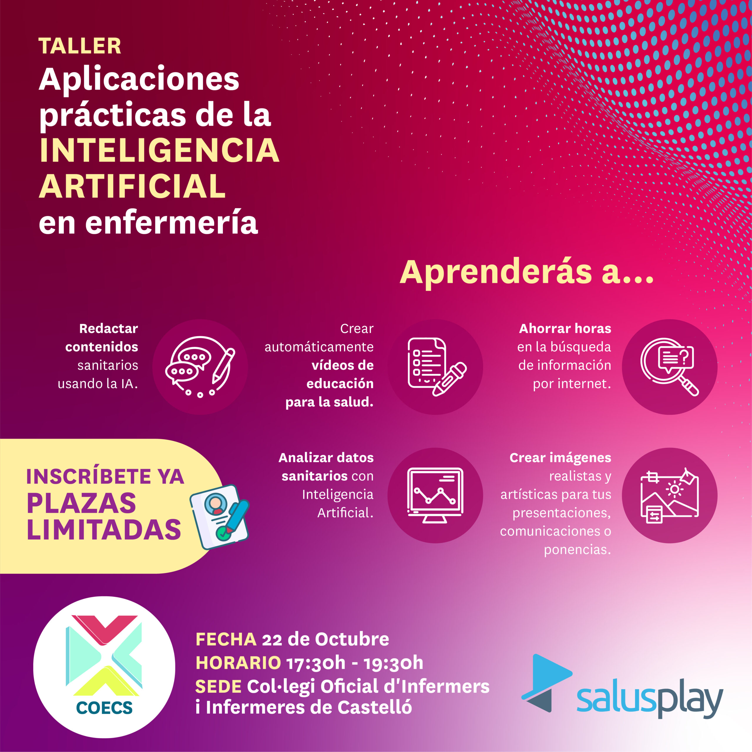 El Colegio Oficial de Enfermeros y Enfermeras de Castellón (COECS) ofrece el taller gratuito «Aplicaciones prácticas con inteligencia artificial en enfermería», impartido por la plataforma SalusPlay. Esta actividad se desarrollará el próximo miércoles, 22 de octubre, entre las 17:30 y las 19:30 horas, en el salón de actos del COECS (av. Virgen del Lidón, 57, bajo – Castellón). Durante la formación, se explicará cómo usar diferentes plataformas de IA y se hará una demostración de diferentes ejercicios prácticos.