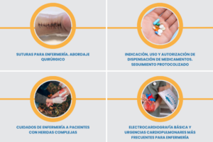 Se trata de los cursos «Suturas para Enfermería. Abordaje quirúrgico», «Cuidados de enfermería a pacientes con heridas complejas», «Indicación, uso y autorización de dispensación de medicamentos. Seguimiento protocolizado» y «Electrocardiografía básica y urgencias cardiopulmonares más frecuentes para enfermería».