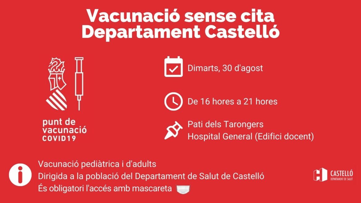 Castellón ofrecerá hoy una jornada de vacunación sin cita previa contra la COVID-19. La sesión se celebrará en horario de 16 a 21 horas en el Pati dels Tarongers del Hospital General. El acceso será obligatorio con mascarilla.