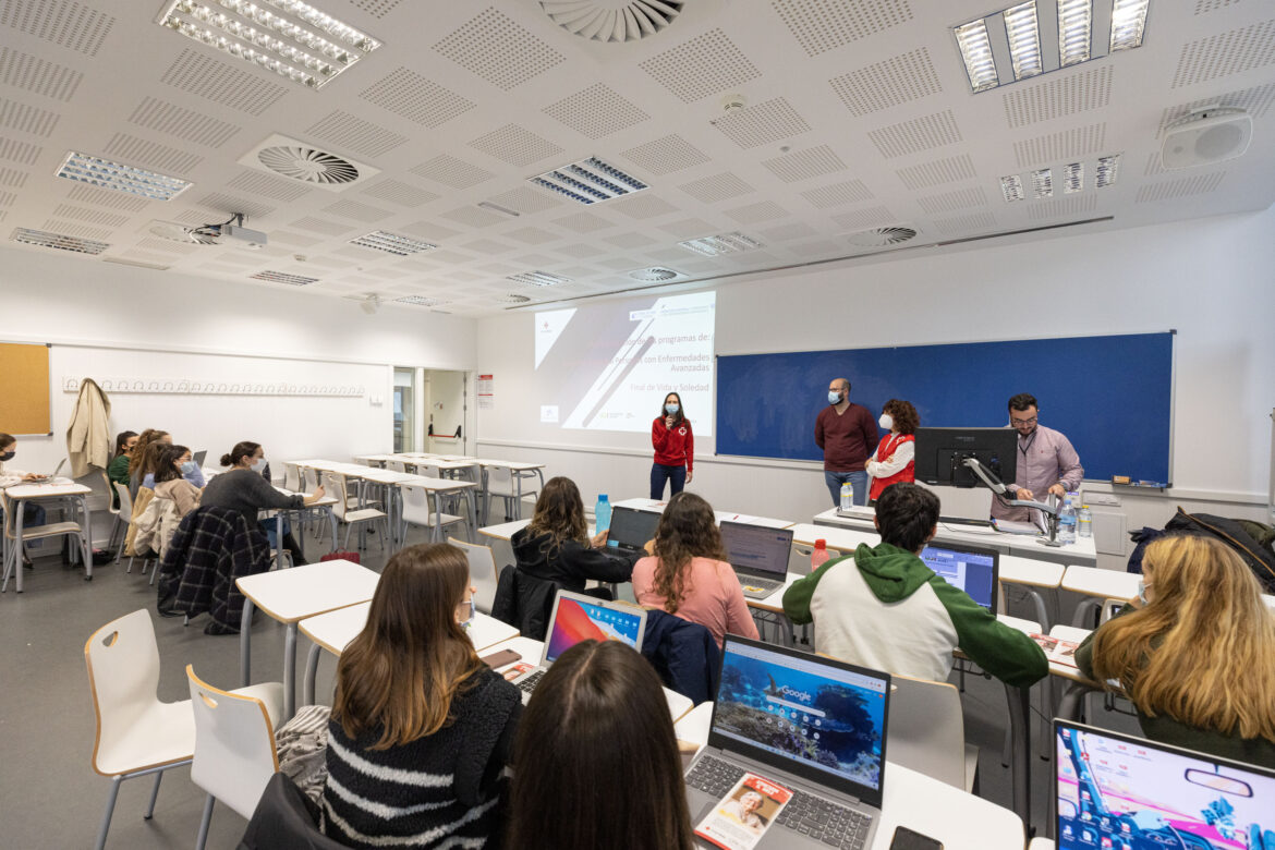 Un equipo de responsables de Cruz Roja ha dado a conocer al estudiantado del Grado en Enfermería los proyectos enmarcados en el Plan de Salud de Cruz Roja 2022 para el apoyo psicosocial y el acompañamiento en el final de la vida, dentro de los contenidos de la asignatura de cuarto curso «Institucionalización y Salud», impartida por el profesor David Usó Bou.