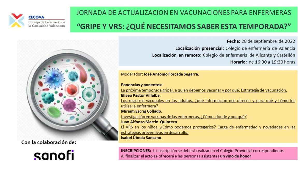 El Consejo de Enfermería de la Comunitat Valenciana (CECOVA) acogerá el próximo miércoles 28 de septiembre la Jornada de Actualización en Vacunaciones para Enfermeras: “Gripe o VRS: ¿qué necesitamos saber esta temporada?”.
