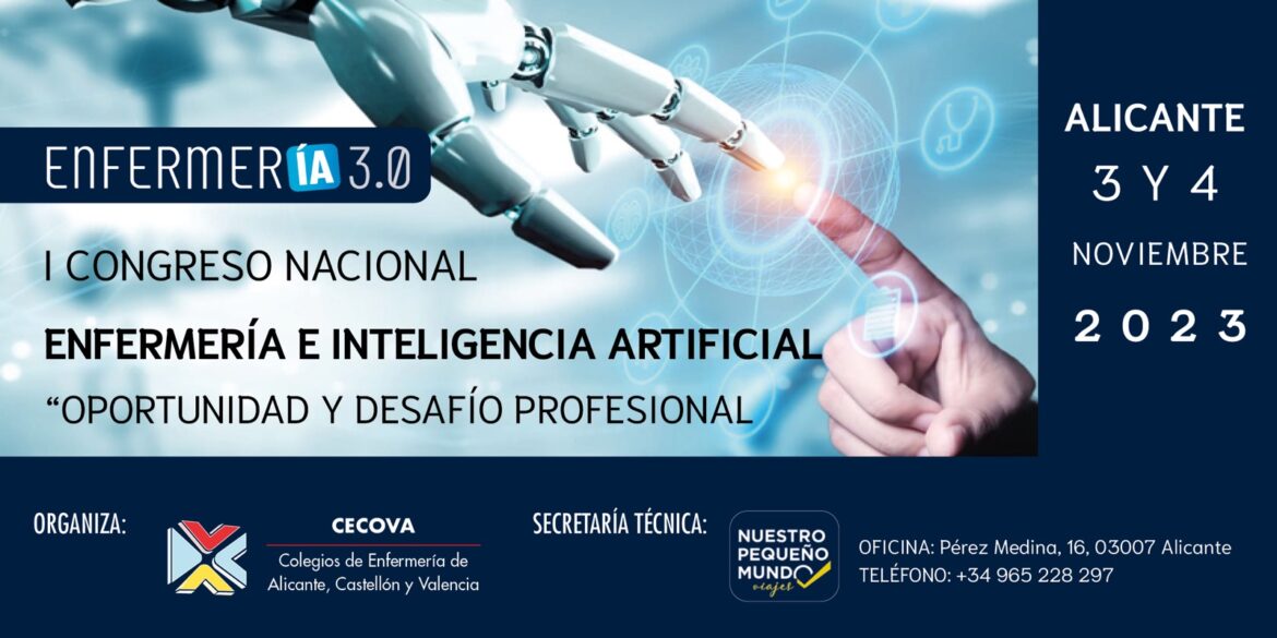El Primer Congreso Nacional de Enfermería e Inteligencia Artificial, organizado a iniciativa del Consejo de Enfermería de la Comunidad Valencina (CECOVA), se celebrará los días 3 y 4 de noviembre en el Hotel Alicante Golf de Alicante. Esta iniciativa se ha propuesto como objetivo principal dar a conocer herramientas de IA, presentar casos de éxito y casos de uso de la IA aplicada a los cuidados enfermeros, incluyendo tecnologías emergentes como asistentes virtuales, chatbots, la realidad aumentada, realidad extendida y realidad virtual.