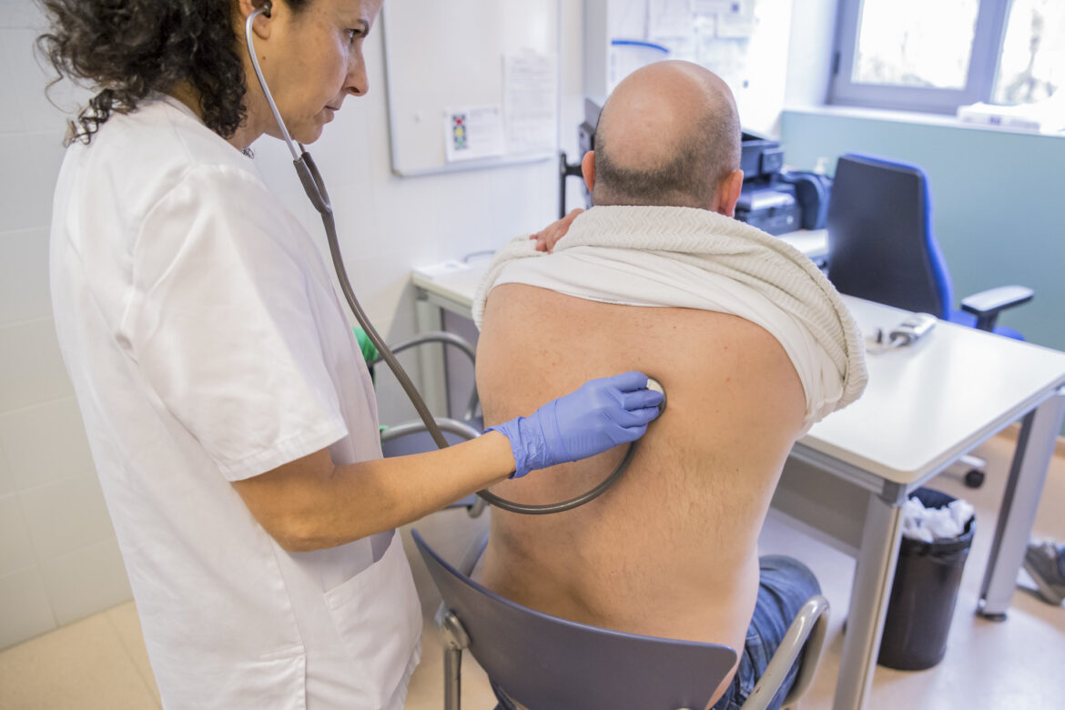 Una enfermera de Atención Primaria realiza una auscultación pulmonar. Banc d’Imatges Infermeres – Autores: Ariadna Creus y Ángel García.