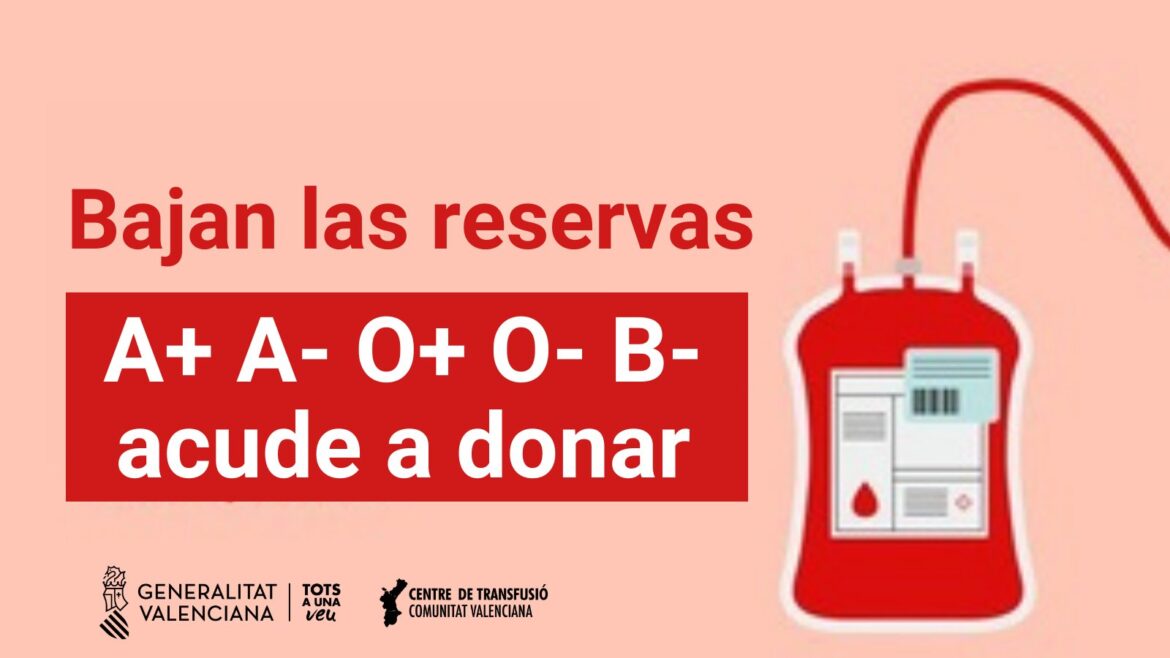 El Centro de Transfusiones de la Comunitat Valenciana ha anunciado que han bajado las reservas de sangre de los grupos A+, A-, O+, O- y B- y ha hecho un llamamiento a las personas con este tipo de sangre para que acudan a donar.