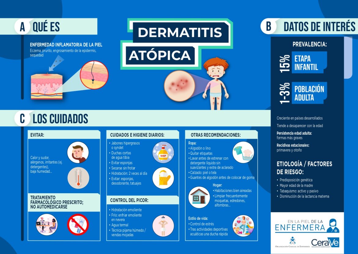 El Consejo General de Enfermería (CGE), en colaboración con CERAVE, en el marco de la campaña «En la piel de la enfermera», han publicado una completa infografía y vídeo animado sobre la dermatitis atópica, una de las patologías de la piel más frecuentes, sobre todo en la infancia, donde su prevalencia alcanza hasta el 20%, y que se caracteriza por el eczema, el prurito, el engrosamiento de la epidermis y la sequedad.