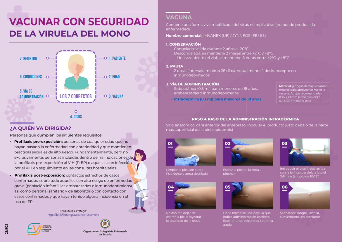 Con el objetivo de ayudar y refrescar estos conocimientos, ambas instituciones han lanzado una infografía y un vídeo animado con todos los detalles de la vacuna contra la viruela del mono: conservación, pauta, paso a paso de la administración intradérmica y personas a las que va dirigida en estos momentos.