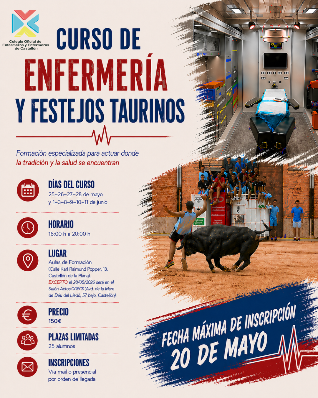 Castellón (28-04-2026) – El Colegio Oficial de Enfermeros y Enfermeras de Castellón (COECS) lanza una nueva edición de su Curso de Enfermería y Festejos Taurinos. Esta formación está diseñada para dotar a los profesionales de los conocimientos necesarios para actuar con seguridad y eficacia en eventos taurinos, donde la rapidez y la especialización técnica son vitales.