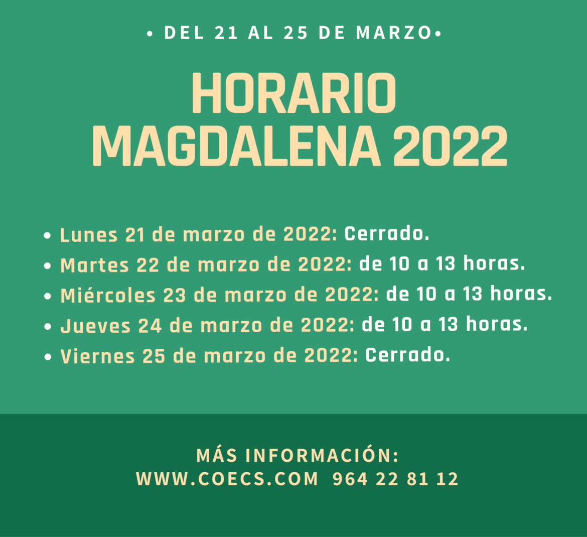 El Colegio Oficial de Enfermeros y Enfermeras de Castellón cambia su horario durante la semana del 21 al 27 de marzo, con motivo de las fiestas de la Magdalena. La atención al público será la siguiente: