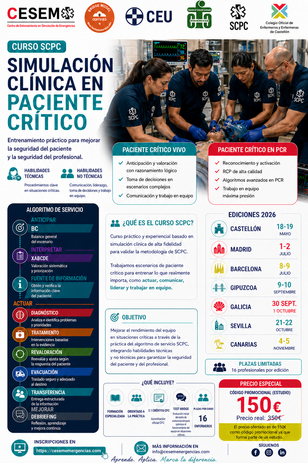 El curso SCPC destaca por ser un programa eminentemente práctico y experiencial que utiliza la simulación clínica de alta fidelidad para validar la metodología de trabajo en situaciones de compromiso vital extremo. El objetivo es que los equipos sanitarios entrenen no solo habilidades técnicas, sino también habilidades «no técnicas» —como el liderazgo, la comunicación asertiva y la gestión del trabajo en equipo— en escenarios de máxima presión.