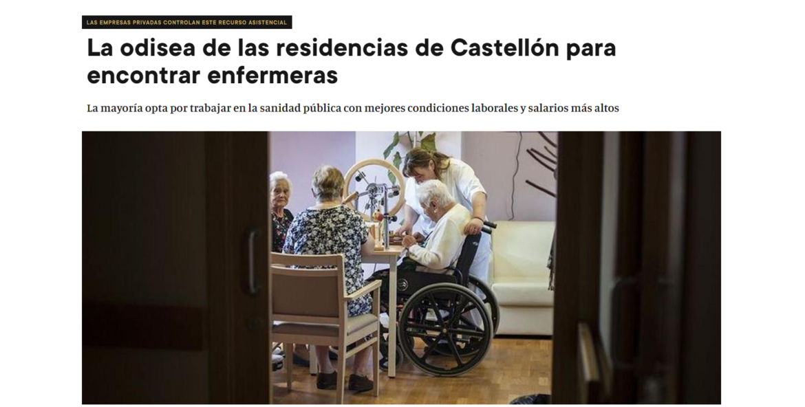 El periódico Mediterráneo ha publicado en su edición de hoy, viernes 27 de enero, un artículo sobre los problemas que las residencias de mayores de la provincia de Castellón afrontan para contratar profesionales enfermeros para sus plantillas. El Colegio Oficial de Enfermeros y Enfermeras de Castellón ofrece su valoración sobre las razones por las que sufren estas dificultades en los procesos de contratación.