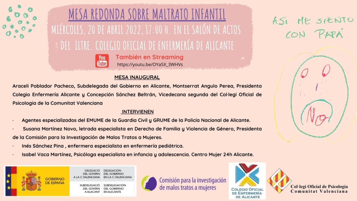 El salón de actos del Colegio de Enfermería de Alicante celebrará mañana, miércoles 20 de abril a partir de las 17.00, una mesa redonda sobre el maltrato infantil. Además, esta cita se podrá seguir por streaming a través del canal de YouTube del Colegio. El acto será moderado por Modes Salazar, jefa de la Unidad contra la Violencia sobre la Mujer de la Subdelegación del Gobierno en Alicante.