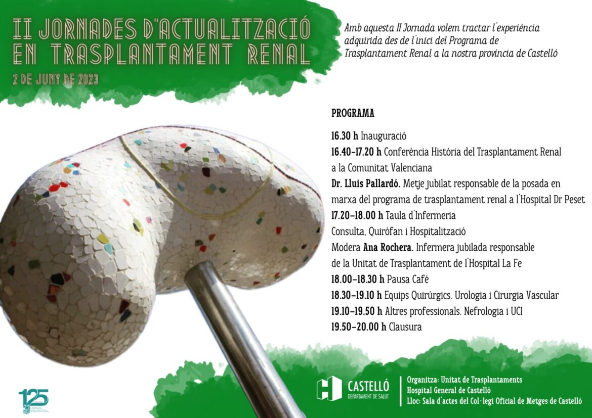 El Colegio Oficial de Médicos de Castellón será el escenario mañana, a partir de las 16.30, de las II Jornadas de Actualización en Trasplante Renal, organizada por la Unidad de Trasplantes del Hospital General de Castellón. La asistencia será libre hasta completar aforo. El objetivo de la jornada es tratar la experiencia adquirida desde el inicio del programa de trasplante renal en la provincial de Castellón.