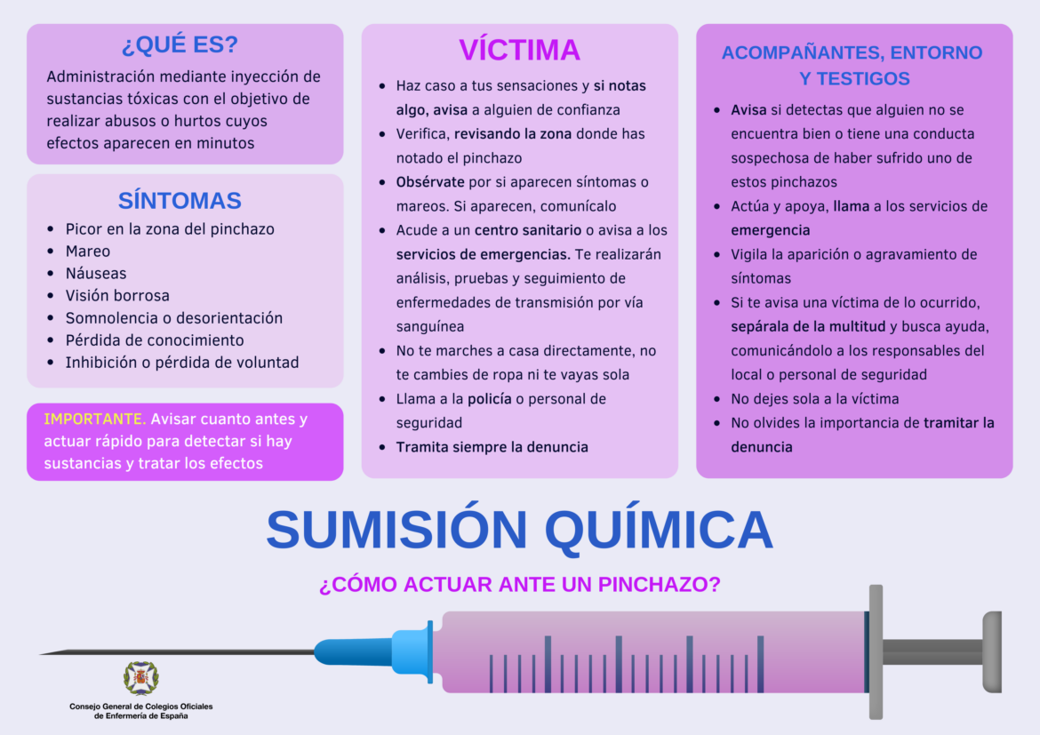 “Los efectos son bastantes inmediatos y si se tiene sensación de pinchazo, hay que advertirlo rápidamente a gente de confianza para que puedan vigilar si se produce una situación de sedación o pérdida de control. Además, antes de que actúe la sustancia, es importante contar si se ha visto a alguien que pudiera ser sospechoso de haber realizado la intromisión a la intimidad de la mujer”, profundiza Diego Ayuso, secretario general del CGE. “Muchas veces, cuando la víctima llega a los servicios hospitalarios, la sustancia ya no se detecta en los análisis, así que es muy importante estar atentos a cualquier sensación extraña”, apunta Ayuso.