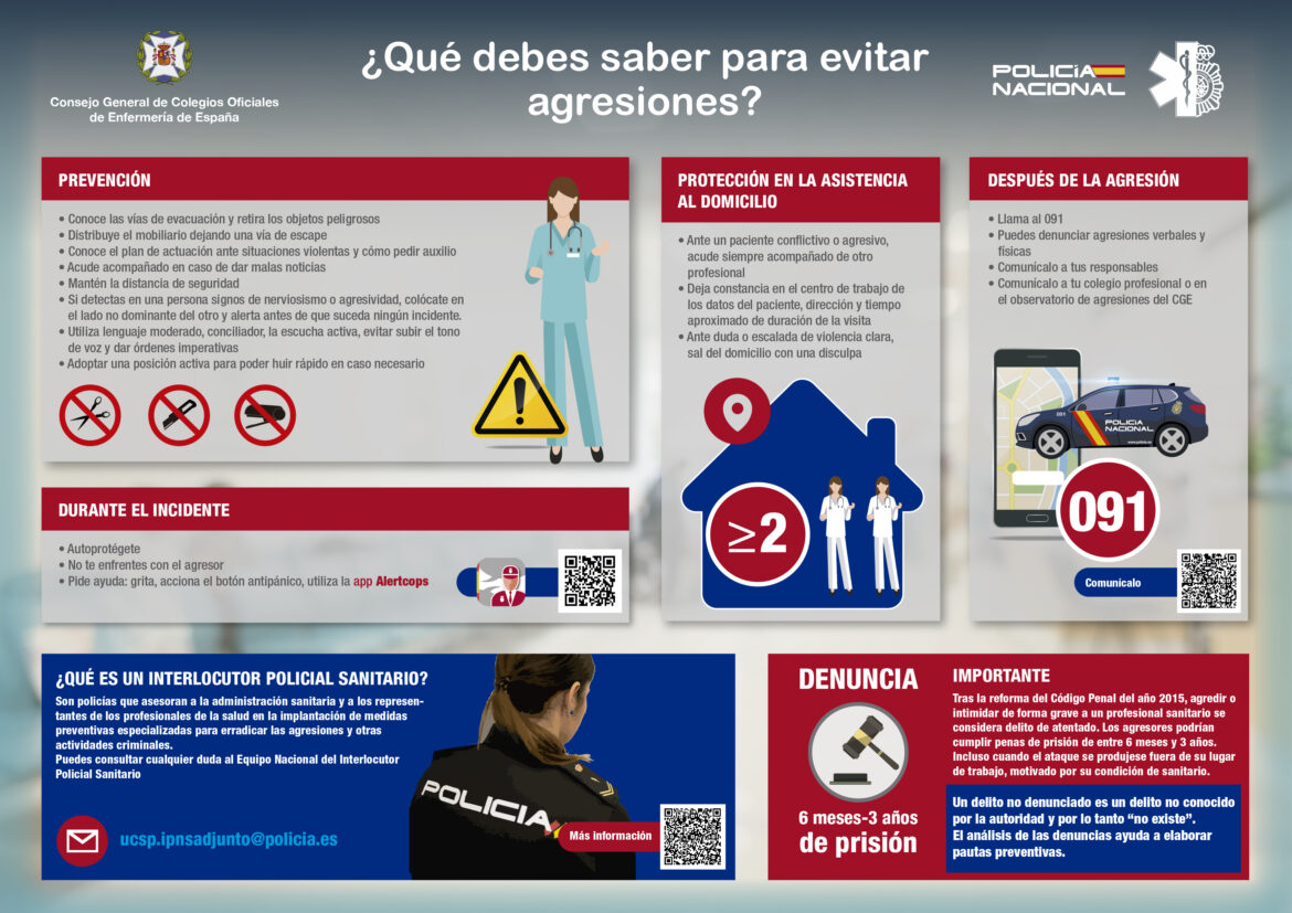 Entre los materiales elaborados para este curso se incluye una infografía y un vídeo animado con los principales consejos para evitar las agresiones a enfermeras. En ellos se refleja cómo prevenirlas, qué hacer durante el incidente, cómo actuar en visitas domiciliarias y qué hacer después de la agresión. También se ofrece información sobre el Interlocutor Policial Sanitario.