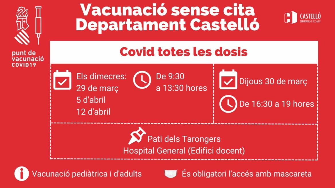 El Departamento de Salud de Castellón ha organizado para las próximas semanas cuatro nuevas jornadas de vacunación sin cita para recibir cualquiera de las dosis contra la COVID-19. El Pati dels Tarongers, el edificio docente del Hospital General de Castellón, será el lugar donde se desarrollarán estas jornadas, entre ellas la de este miércoles, 29 de marzo, que se celebrará de 9.30 a 13.00. Además, el jueves, 30 de marzo, también habrá otra sesión de vacunación en horario de 16.30 a 19.00.