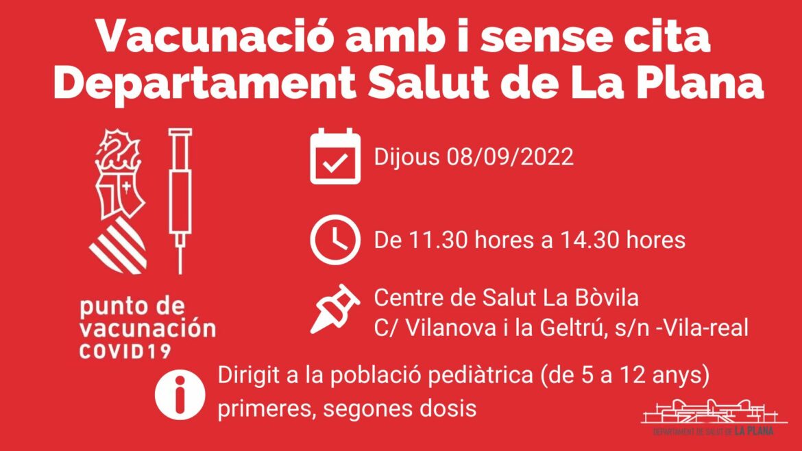 El Departamento de Salud de La Plana ha organizado para el próximo jueves, 8 de septiembre, una nueva jornada de vacunación pediátrica (5 a 12 años) contra el COVID-19 que se desarrollará en el Centre de Salut La Bòvila (Vila-real). El horario será de 11.30 a 14.30 horas, y la vacunación será con y sin cita previa.