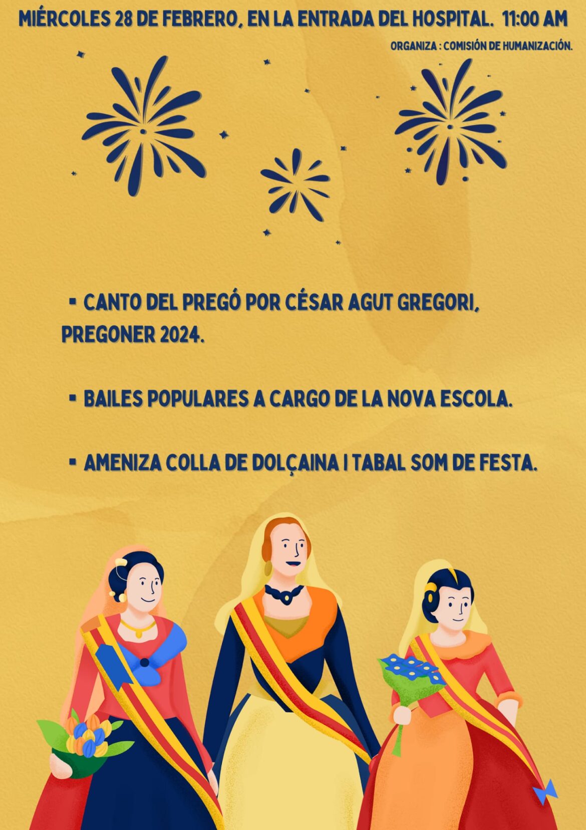 Por su parte, para el próximo miércoles, 28 de febrero, a partir de las 11.00 en la entrada del hospital, el pregoner de las fiestas de la Magdalena 2024, César Agut Gregori, se encargará de cantar el pregó. La cita se completa con una sesión de bailes populares a cargo de la Nova Escola, que estará acompañada por la música de la Colla de Dolçaina i Tabal Som de Festa. GVA HLaMagdalena