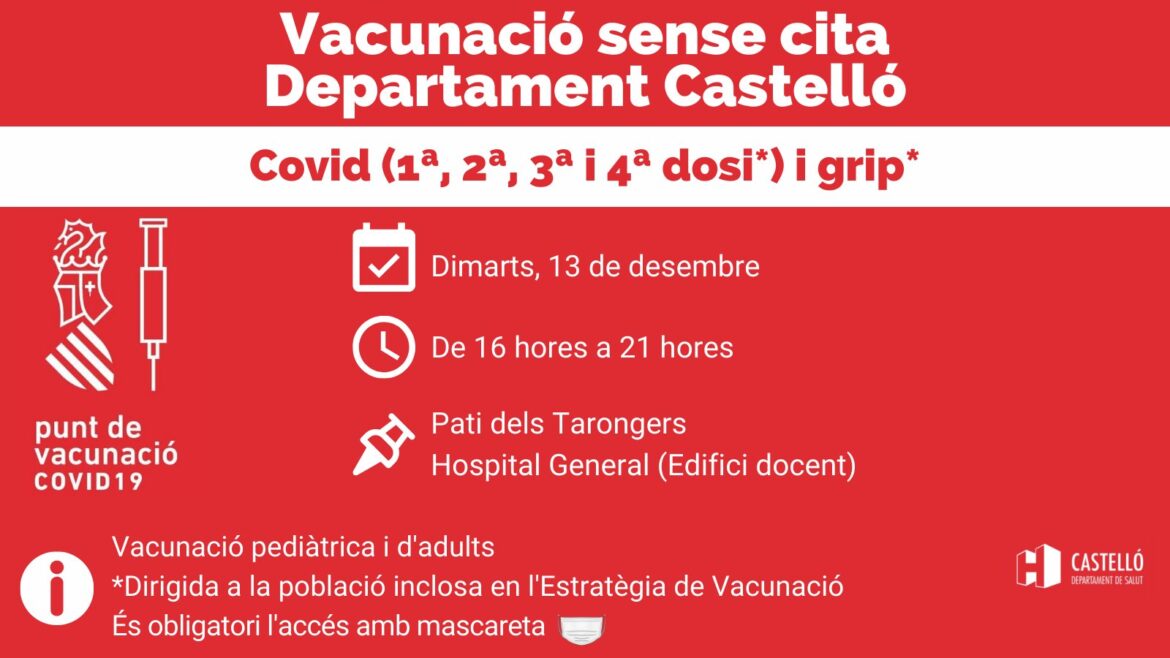 El Departamento de Salud de Castellón ha anunciado que mañana, martes 13 de diciembre, acogerá una nueva jornada de vacunación sin cita previa. Ésta se desarrollará en el Pati dels Tarongers del Hospital General de Castellón en horario de 16.00 a 21.00 y se inocularán tanto la vacuna contra la COVID-19, en cualquiera de sus dosis, como la vacuna contra la gripe.