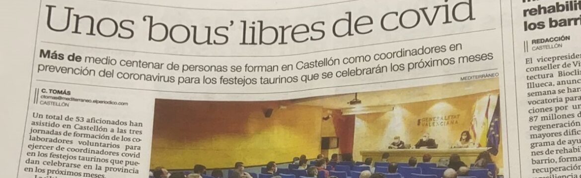 El Periódico Mediterráneo se hizo eco en su edición de ayer, martes 25 de enero, de la sesión formativa sobre la figura del coordinador COVID-19 en festejos taurinos, a la que asistieron las personas designadas como coordinadores/as COVID-19 en los “bous al carrer” por cada municipio en los que está previsto que se celebren festejos en enero o febrero próximo.