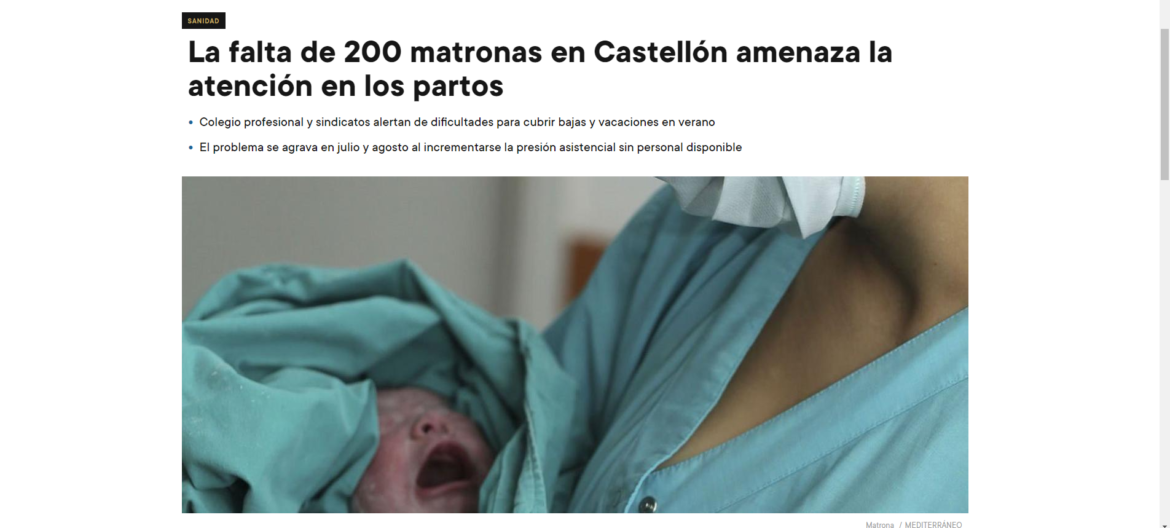 El Periódico Mediterráneo ha publicado hoy, 1 de agosto, un artículo en el que se recogen las declaraciones del presidente del Colegio Oficial de Enfermeros y Enfermeras de Castellón (COECS), Francisco Javier Pareja que analiza y explica las razones por las que la provincia de Castellón sufre una carencia de enfermeras matronas. Esta situación amenaza la correcta atención de los partos, y señala la necesidad de incrementar el número de plazas de especialistas.