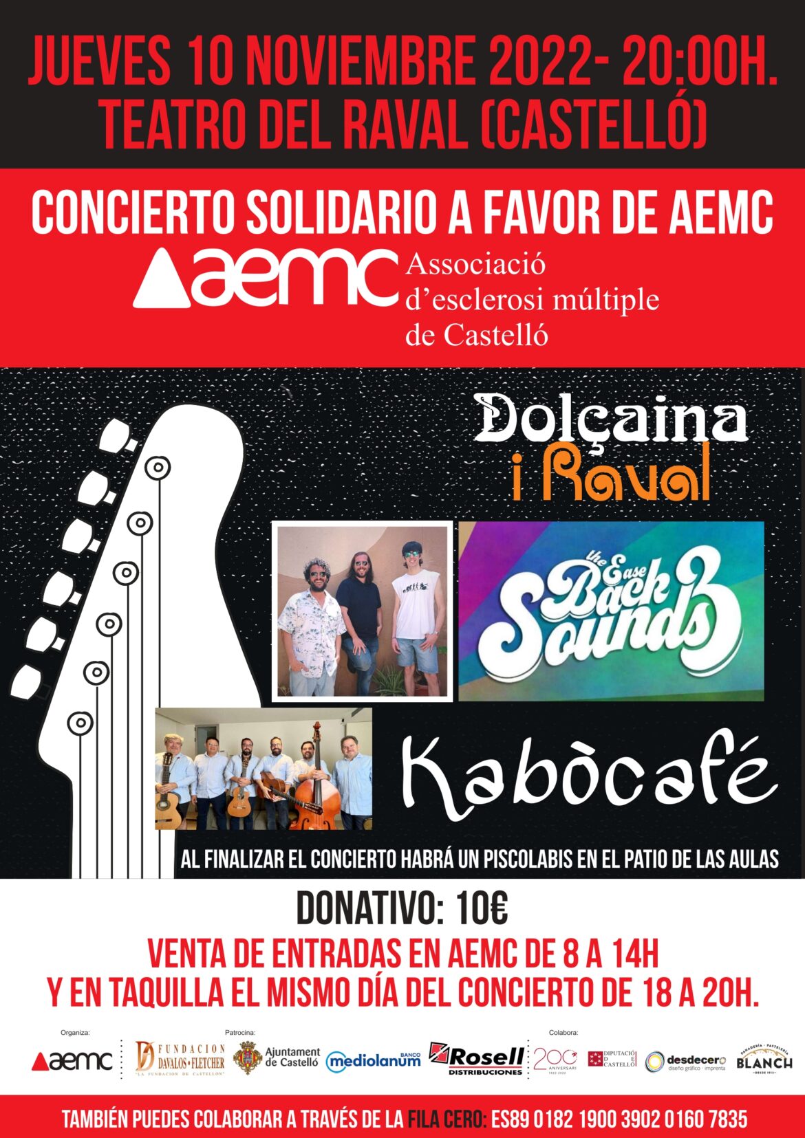 La Asociación Esclerosis Múltiple de Castellón (AEMC) ofrecerá este jueves, en el Teatre del Raval de Castellón una nueva edición de su concierto solidario para recaudar fondo para la lucha contra la esclerosis múltiple. Las actuaciones comenzarán a las 20.00 y correrá a cargo de los grupos Dolçaina i Raval, The Ease Back Sounds y Kabòcafé.
