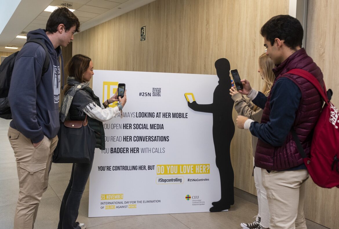 Junto a los vídeos compartidos en YouTube, se han colocado en los accesos a los edificios de los tres campus del CEU varios paneles informativos sobre esta campaña con códigos QR para dirigir a los vídeos, con mensajes como: “Si mira siempre tu móvil, si controla tus redes sociales, si lee tus conversaciones, si te llama a todas horas, si te pregunta dónde estás, con quién estás, a qué hora vuelves… te controla, pero ¿te quiere?”. Esta campaña de concienciación promovida por la Unidad de Igualdad y el Vicerrectorado de Estudiantes y Vida Universitaria de la Universidad CEU Cardenal Herrera.