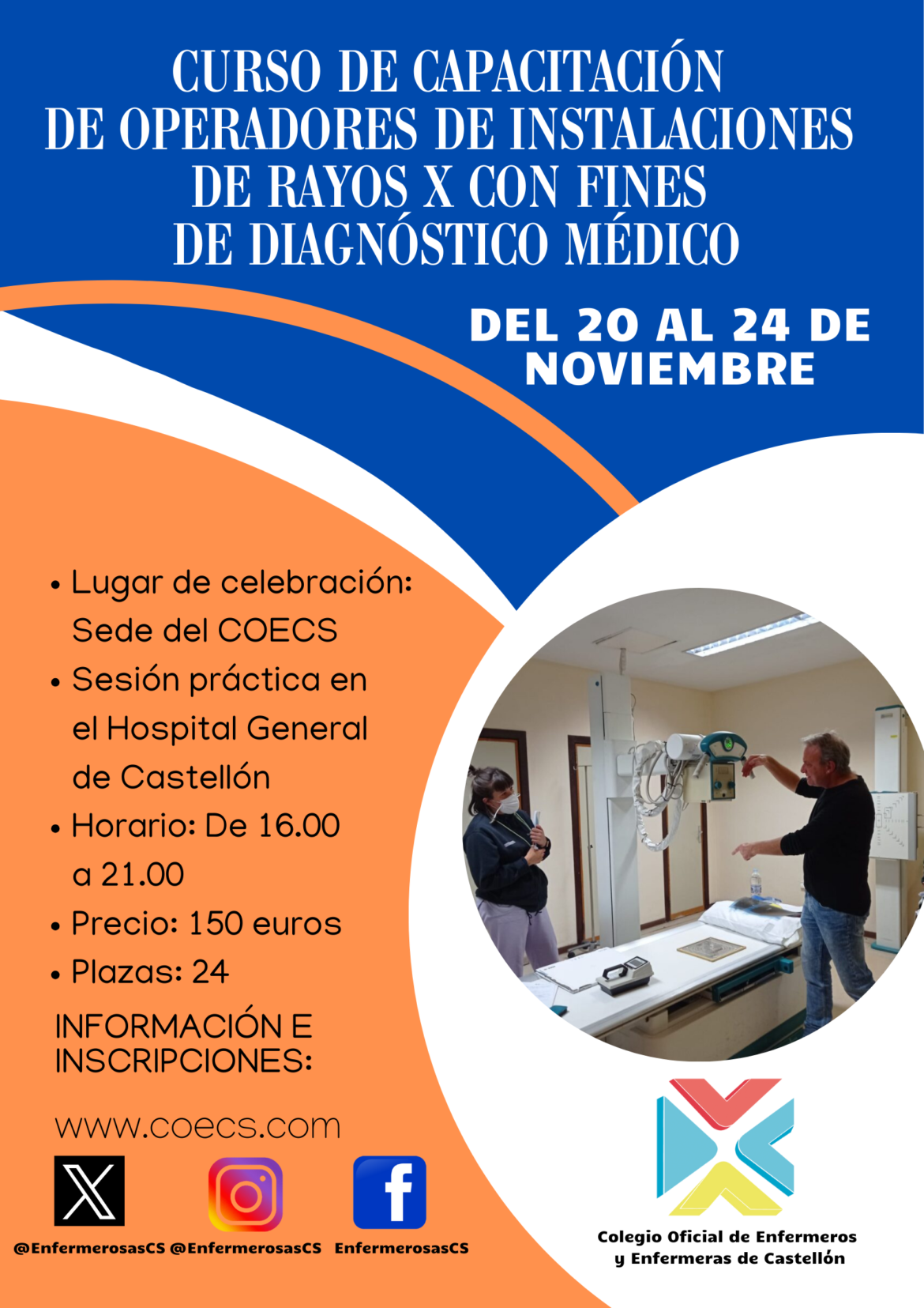 El Colegio Oficial de Enfermeros y Enfermeras de Castellón (COECS) ha abierto el plazo de inscripción al curso de Capacitación de Operadores de Instalaciones de Rayos X con Fines de Diagnóstico Médico, que se celebrará en las aulas de formación del COECS, ubicadas en la calle Karl Raimund Popper, 13 bajos. En total, el ente colegial ofrece 24 plazas. Esta formación, de un total de 24 horas, se desarrollará entre el lunes 20 y el viernes 24 de noviembre, en horario de 16.00 horas a 21.00 horas. La asistencia es obligatoria a la totalidad de las sesiones y la matrícula del curso tiene un precio de 150 euros.