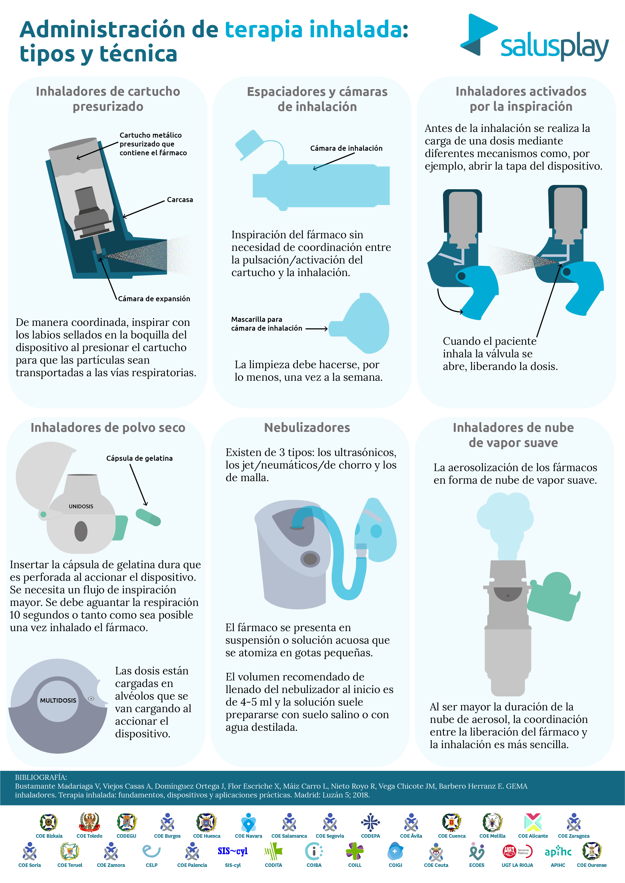 La plataforma de formación de enfermeros y enfermeras, SalusOne de SalusPlay ha compartido una nueva infografía basada en evidencias. En esta ocasión, la infografía se titula “Administración de terapia inhalada: tipos y técnica”, en la que se explican las principales características de los dispositivos de terapia inhalada y las opciones de tratamiento que ofrecen en función de las necesidades del paciente.