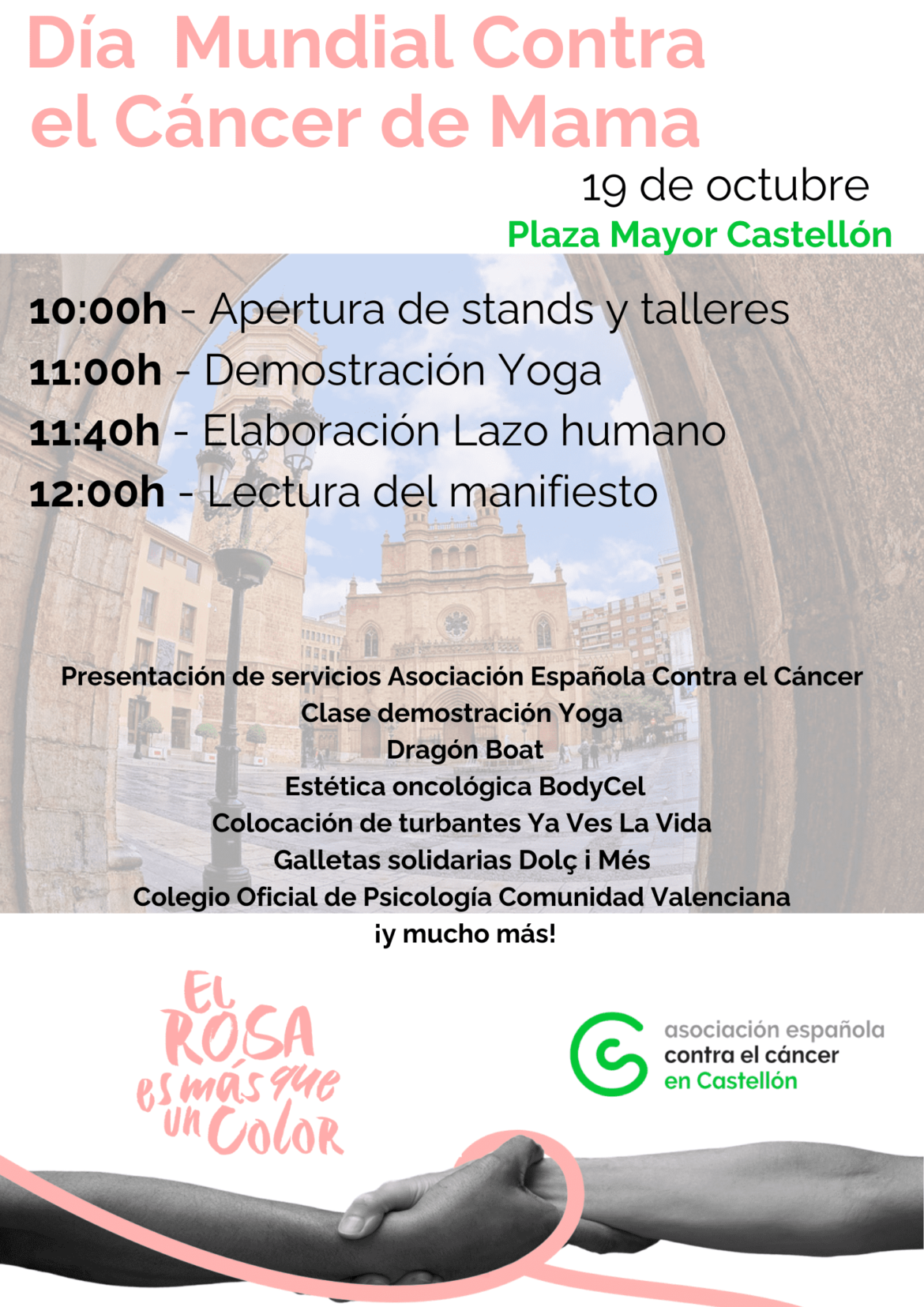 La Asociación Española Contra el Cáncer en Castellón conmemorará el próximo jueves,19 de octubre el Día Mundial contra el Cáncer de Mama con una jornada repleta de actos que se celebrará en la plaza Mayor de la capital de la Plana, y que dará comienzo a las 10.00 con la apertura de estands y la celebración de talleres.