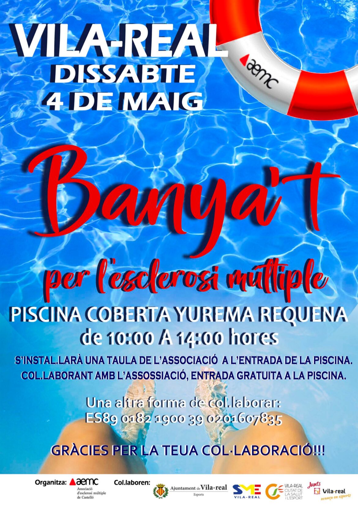 Un año más, la Associació d’Esclerosi Múltiple de Castelló pone en marcha, un año más, la campaña «Banya’t per l’esclerosi múltiple» que se celebrará durante el mes de mayo en las diferentes piscinas de la provincia de Castellón como Vila-real, Onda, Nules y la Vall d’Uixó. La iniciativa invita a la sociedad a acudir a las piscinas donde se desarrolla la campaña y que el mayor número de personas se impliquen en la causa y naden en solidaridad por la esclerosis múltiple. Además, se podrá colaborar realizando una donación o bien adquiriendo cualquier producto de merchandising de la asociación.