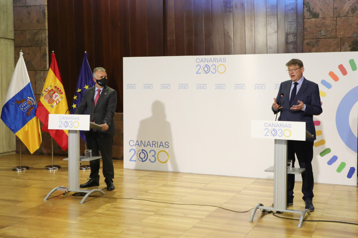 El president de la Generalitat, Ximo Puig, y el presidente del Gobierno de Canarias, Ángel Víctor Torres, han firmado un convenio de colaboración para la gestión y la prestación de servicios propios en materia de innovación sanitaria a través del Proyecto de Medicina Personalizada Big Data.