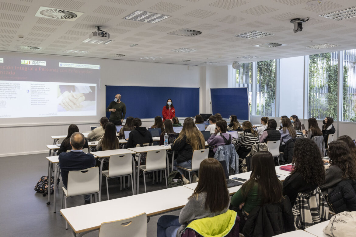 En la sesión han intervenido Mamen Villate, psicóloga y coordinadora del proyecto «Final de vida y soledad», y Francisco Javier Morales, psicólogo del equipo del proyecto «Atención integral a personas con enfermedades avanzadas», que han explicado la labor que realizan desde estos programas de la Fundación la Caixa, además de dar herramientas y recursos al alumnado para aliviar el sufrimiento al final de la vida durante su desempeño en el futuro como profesionales de la salud. UJI