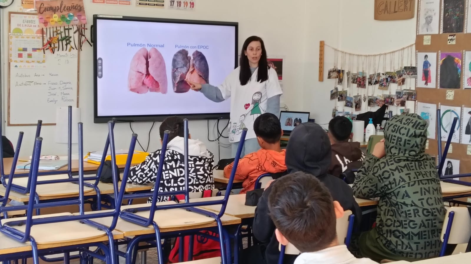 La sesión incluyó material audiovisual impactante para comparar un pulmón sano con uno afectado por EPOC (Enfermedad Pulmonar Obstructiva Crónica), mostrando no solo el cambio de color, sino la grave pérdida de capacidad respiratoria y la alteración de otros órganos como el corazón.