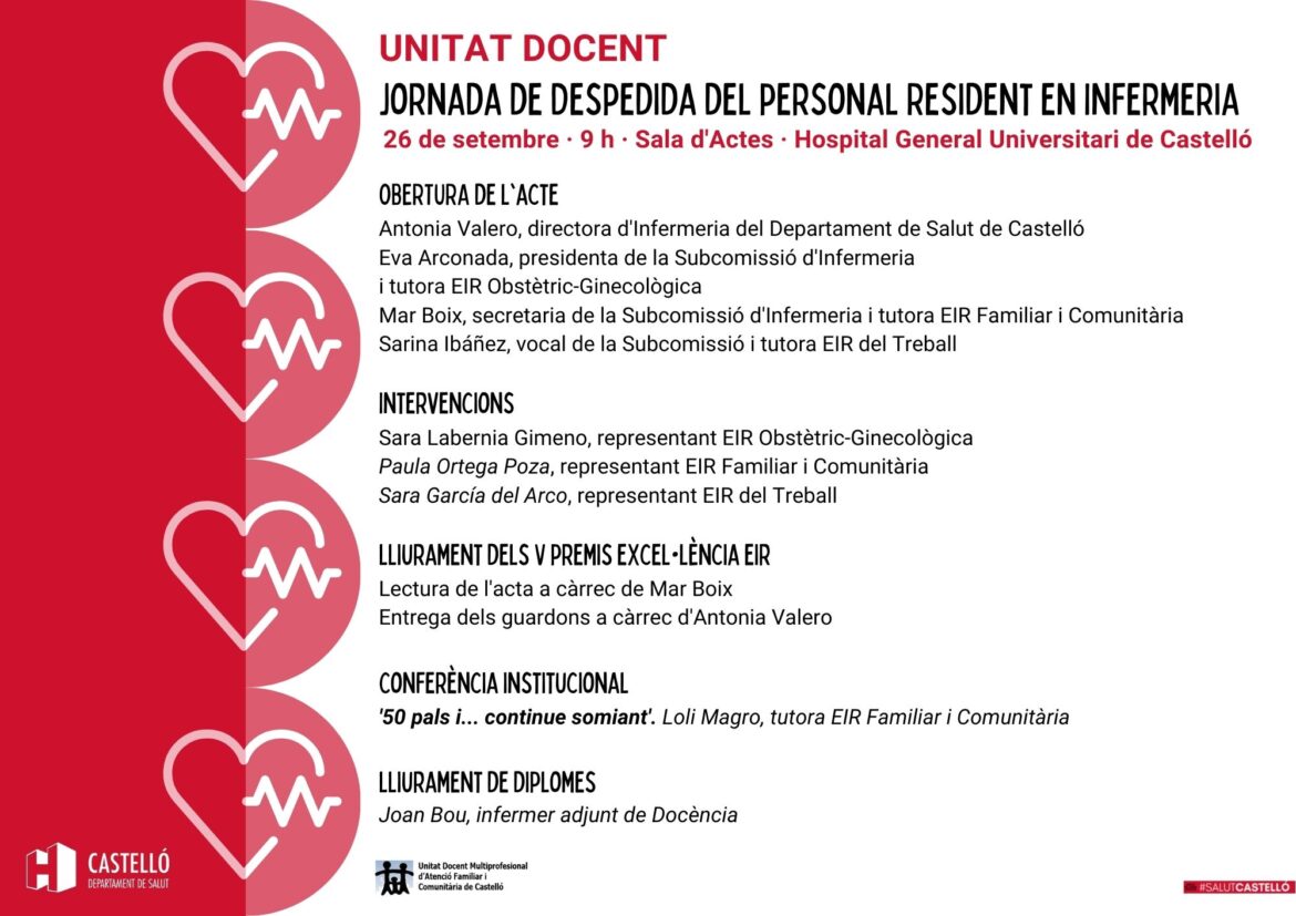 La Unidad Docente del Departamento de Salud de Castellón celebra el próximo lunes, 26 de septiembre, la jornada de despedida del personal residente en Enfermería con un acto institucional en el que está previsto que participen EIR de las tres especialidades que ofrece el Departamento de Salud de Castellón: familiar y comunitaria, del trabajo y ginecología-obstétrica.