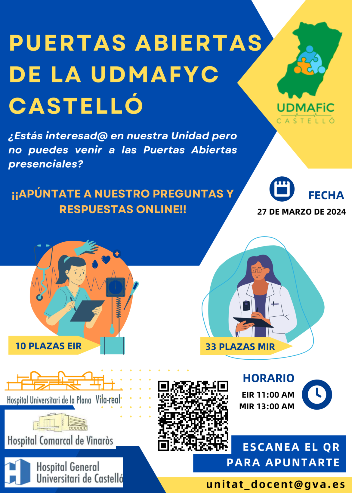 La Unidad Docente de Multiprofesional de Atención Familiar y Comunitaria de Castellón ha organizado para el próximo miércoles, 27 de marzo una jornada online de puertas abiertas. Esta iniciativa, que se dirige a estudiantes EIR y MIR, dará comienzo a las 11.00 en el caso de los/as enfermeras EIR.