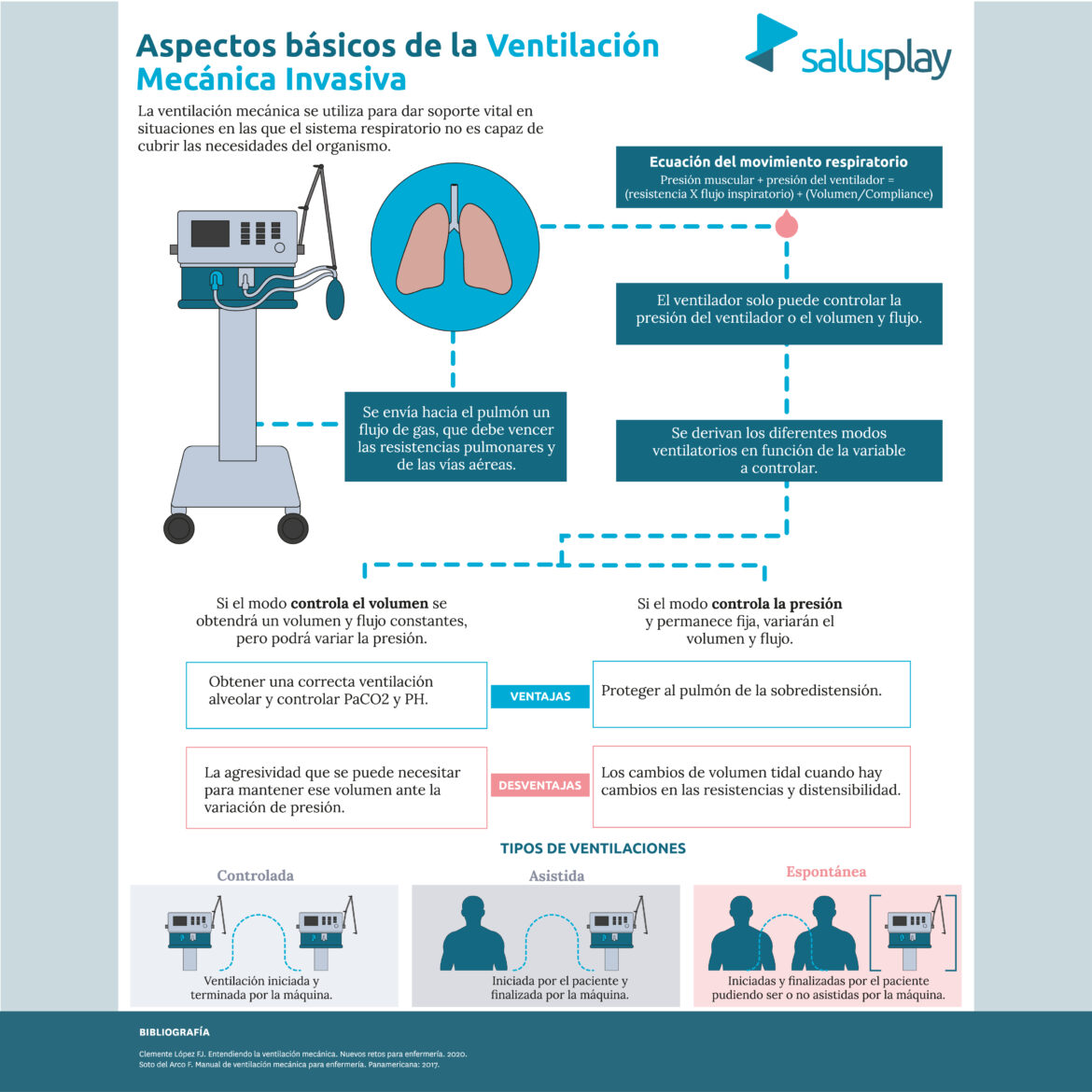 La infografía ofrece a los inscritos en SalusOne las claves sobre el sistema de ventilación mecánica invasiva, que se usa para dar soporte vital en situaciones en las que el sistema respiratorio no cubre las necesidades del organismo. En este enlace, se puede acceder tanto a la infografía como el resumen basado en evidencias.