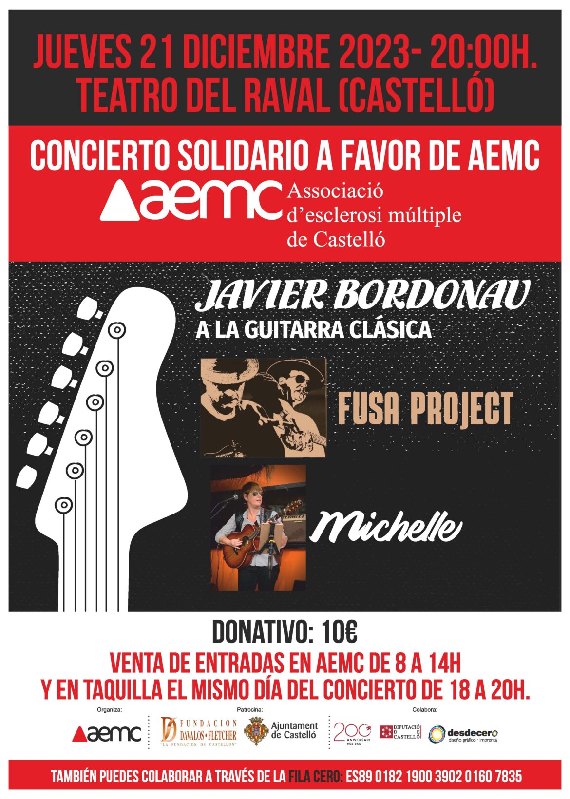 Además, con motivo del Día Nacional de la EM, también se desarrollará el martes 19 de diciembre el sorteo de una rifa solidaria que es posible gracias a la colaboración de más de 40 comercios que han donado regalos para la misma. Aparte, el jueves 21 tendrá lugar un concierto solidario a beneficio de AEMC, que dará comienzo a las 20.00 en el Teatro del Raval de Castellón, con la actuación de Javier Bordonau a la guitarra clásica, Fusa Project y Michelle. Todos ellos son grupos que actuaran de forma altruista. El donativo por entrada es de 10 euros, íntegros para la asociación. También se puede colaborar a través de la fila cero en el número de cuenta ES89 0182 1900 3902 0160 7835.