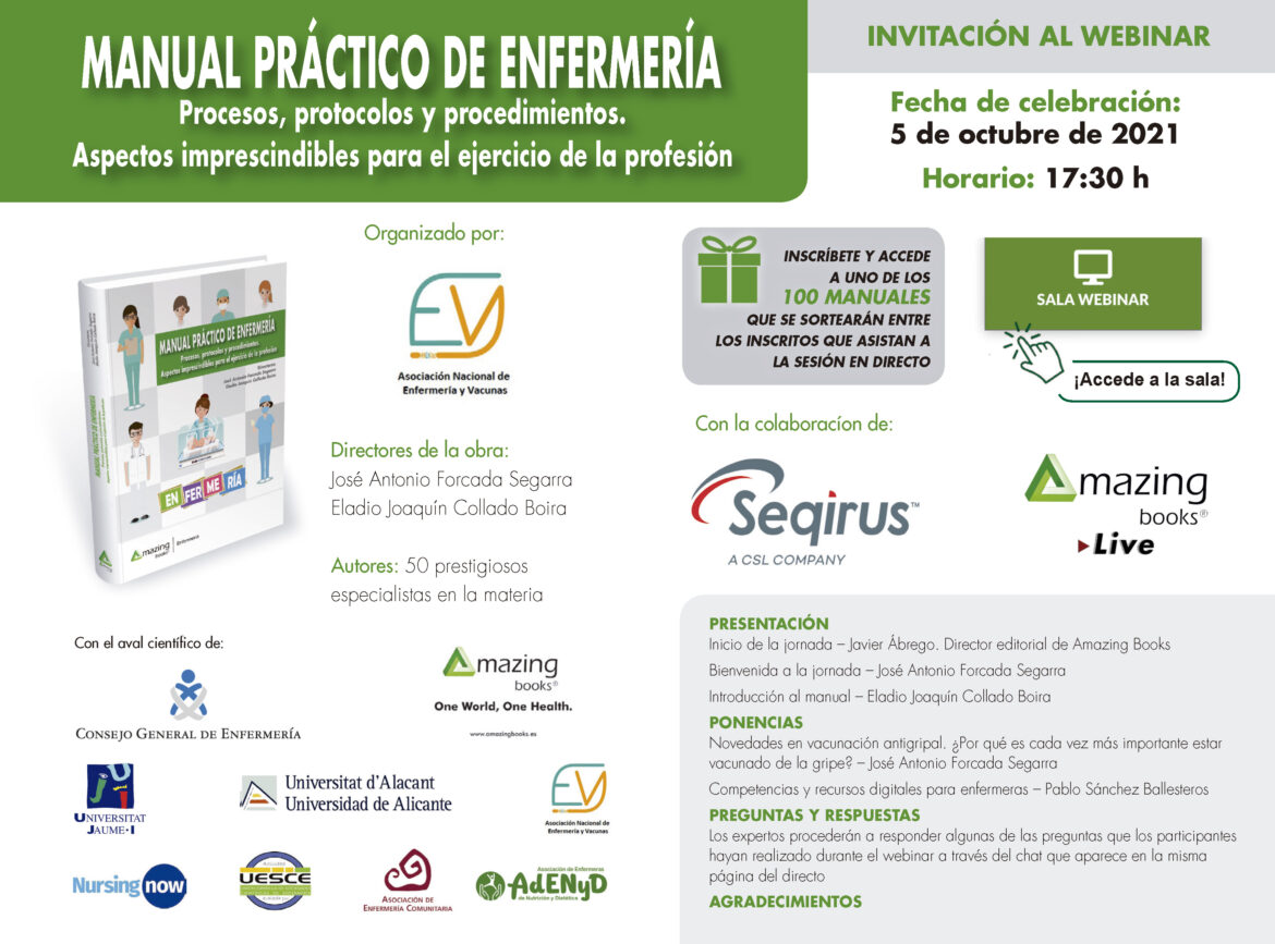 Hoy, martes 5 de octubre, los enfermeros Eladio Collado, vicedecano de la Facultad de Ciencias de la Salud y director del Grado de Enfermería de la Universitat Jaume I, y José Antonio Forcada, presidente de la Asociación Nacional de Enfermería y Vacunas (ANENVAC), participarán en un webinar organizado por la Asociación Nacional de Enfermería y Vacunas en el que presentarán su libro «Manual práctico de Enfermería: procesos, protocolos y procedimientos. Aspectos imprescindibles para el ejercicio de la profesión». El acto comenzará a las 17.30 horas y contará con Javier Ábrego, director editorial de Amazing Books, como presentador.