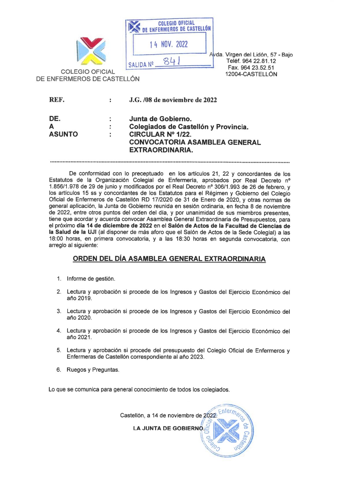 El Colegio Oficial de Enfermeros de Castellón ha convocado la Asamblea General para el próximo MIÉRCOLES 14 de DICIEMBRE en el Salón de Actos de la Facultad de Ciencias de la Salud de la Universitat Jaume I de Castellón (UJI) – Avenida de Vicent Sos Baynat, s/n, 12006 Castelló. Tienes toda la información en el documento de la parte superior de esta información.