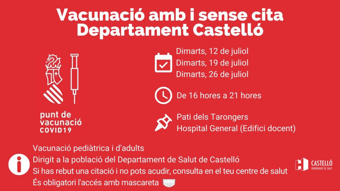 La conselleria de Sanitat Universal y Salut Pública quiere impulsar la vacunación frente a la COVID-19, gracias a la instalación de puntos de vacunación sin cita previa distribuidos por toda la Comunitat Valenciana. Por eso, durante todos los martes del mes de julio, el Pati dels Tarongers, anexo al Hospital General Universitari de Castelló, mantendrá abierto un punto de vacunación esta tarde, en horario de 16.00 a 21.00 horas.