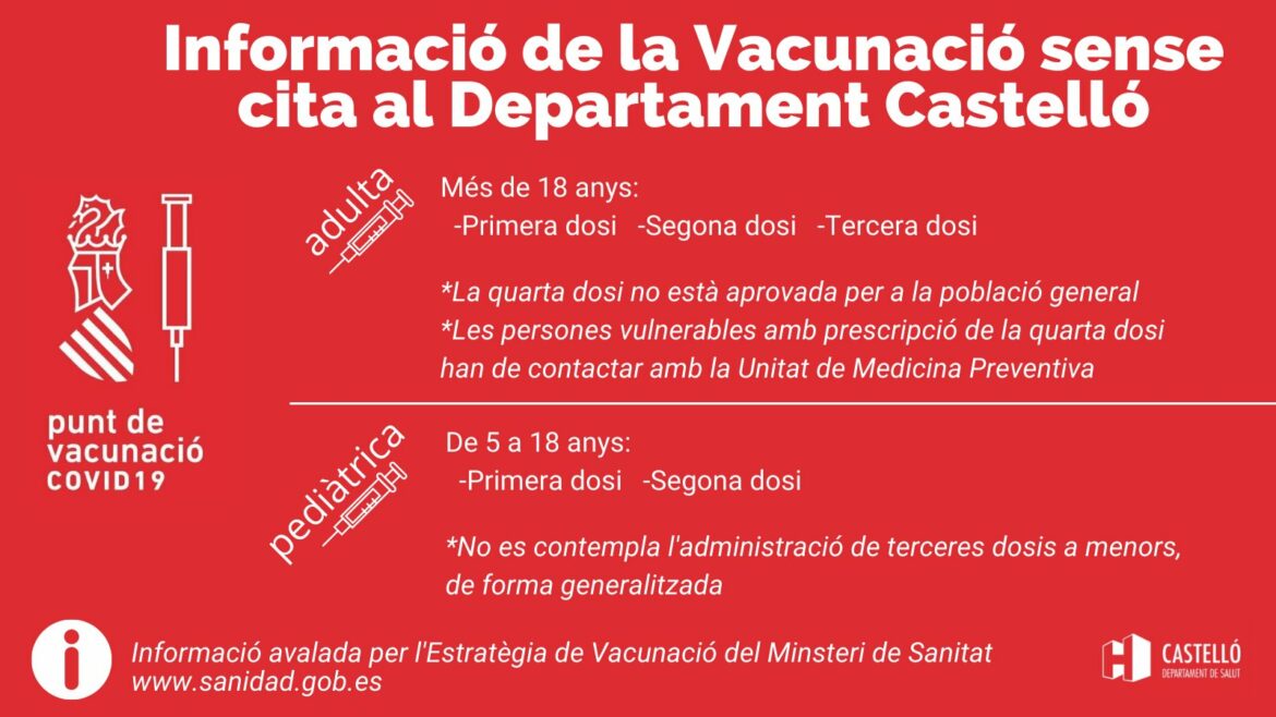 La conselleria de Sanitat Universal y Salut Pública quiere impulsar la vacunación frente a la COVID-19, gracias a la instalación de puntos de vacunación sin cita previa distribuidos por toda la Comunitat Valenciana. Por eso, durante todos los martes del mes de julio, el Pati dels Tarongers, anexo al Hospital General Universitari de Castelló, mantendrá abierto un punto de vacunación esta tarde, en horario de 16.00 a 21.00 horas.