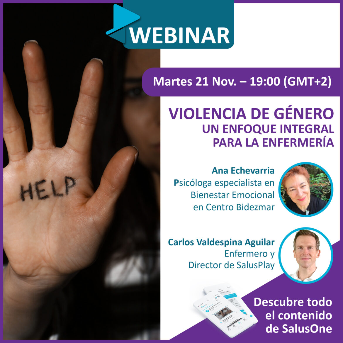 SalusOne, la plataforma formativa de enfermeros y enfermeras de SalusPlay, prepara dos nuevos webinares para sus usuarios. De esta forma, mañana martes, 21 de noviembre, ofrecerá la charla titulada «Violencia de género: un enfoque integral para la enfermería». El webinar comenzará a las 19.00 y profundizará en los aspectos psicológicos de la violencia de género, dando al personal de enfermería recursos que puedan aplicar en su práctica asistencial diaria. La ponente será la psicóloga Ana Echevarría.