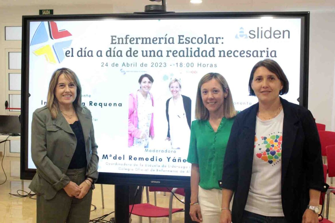 Silvia Chamorro Gil, enfermera escolar y presidenta de la Asociación Científica Española de Enfermería y Salud Escolar de la Comunidad Valenciana (ACEESE-CV), E Inmaculada Requena Ayala, enfermera escolar, ambas enfermeras escolares en el American School of Valencia, dieron a conocer la realidad diaria de las enfermeras escolares en el webinar que ofrecieron el pasado lunes en la Escuela de Liderazgo (ESLIDEN) del Colegio de Enfermería de Alicante, cuya coordinadora es María del Remedio Yáñez Motos.