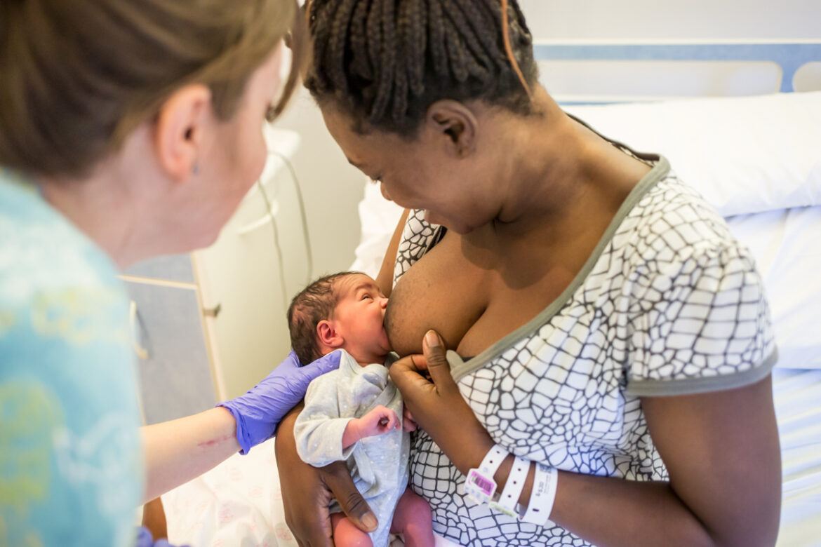 Una enfermera ayuda a una mujer a amamantar a su bebé (Fotografía: Ariadna Creus y Àngel García-Banc d’Imatges Infermeres).
